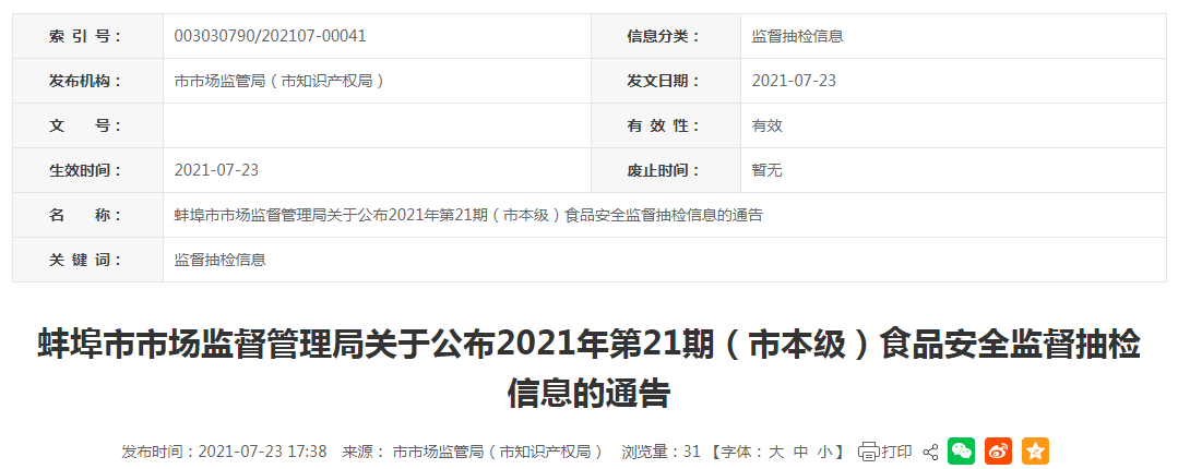 中國(guó)質(zhì)量新聞網(wǎng)訊 近日,安徽省蚌埠市市場(chǎng)監(jiān)督管理局公布2021年第21期(市本級(jí))食品安全監(jiān)督抽檢信息。本期抽檢酒類(lèi)44批次,合格44批次,具體信息如下: