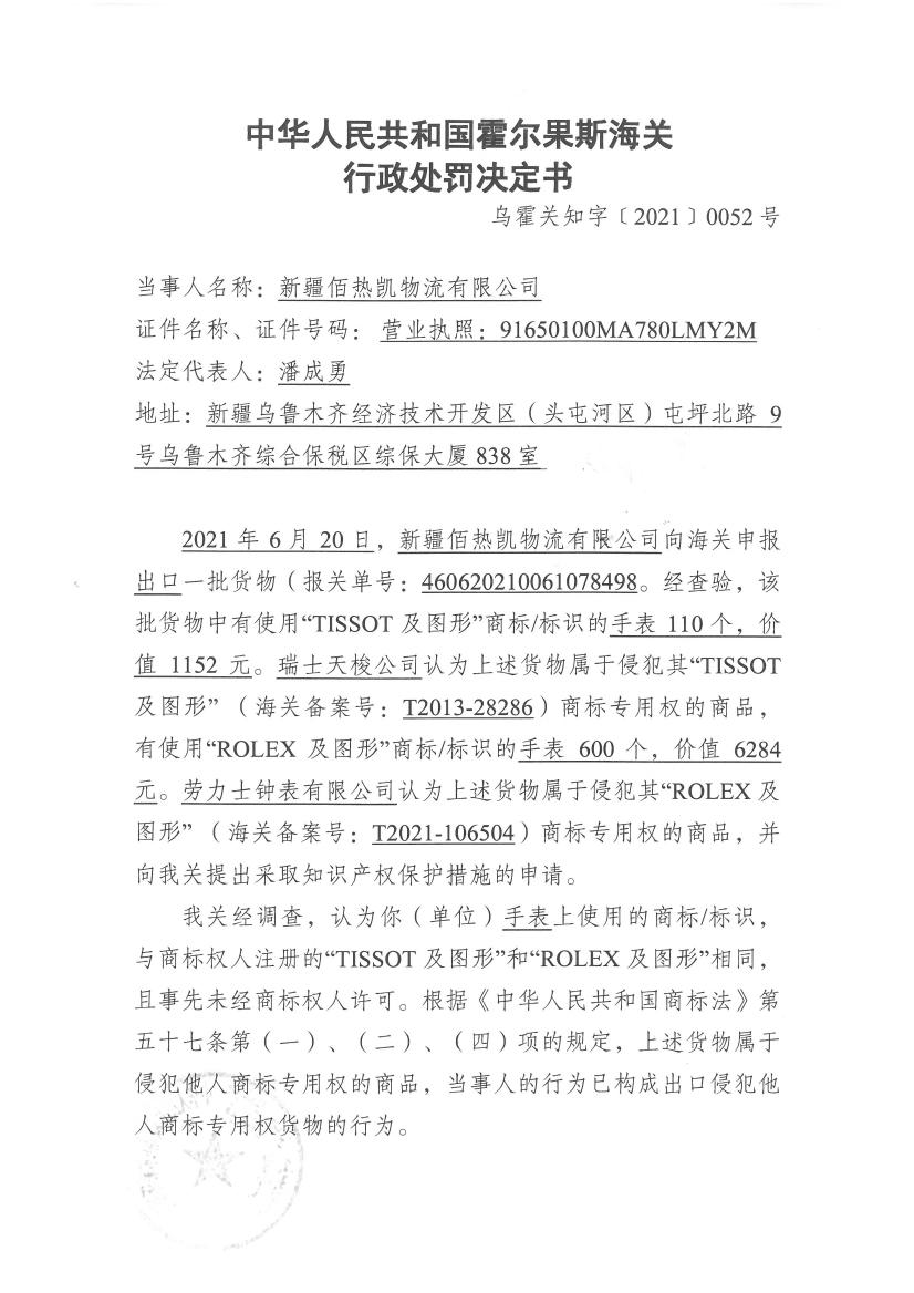 中國(guó)質(zhì)量新聞網(wǎng)訊 近日,烏魯木齊海關(guān)網(wǎng)站發(fā)布霍爾果斯海關(guān)關(guān)于新疆佰熱凱物流有限公司出口侵犯“TISSOT”等商標(biāo)專用權(quán)的行政處罰決定書(烏霍關(guān)知字〔2021〕0052號(hào))。詳情見下。