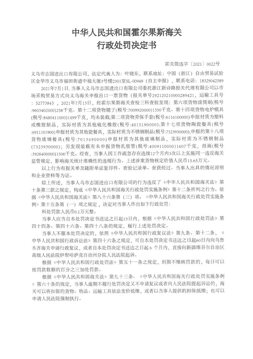 中國質(zhì)量新聞網(wǎng)訊 近日,烏魯木齊海關(guān)網(wǎng)站發(fā)布霍爾果斯海關(guān)關(guān)于義烏市志國進(jìn)出口有限公司出口貨物申報不實及未申報的行政處罰決定書(霍關(guān)簡違字〔2021〕0022號)。詳情見下。