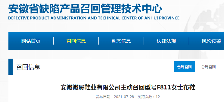 中國(guó)質(zhì)量新聞網(wǎng)訊 據(jù)安徽省缺陷產(chǎn)品召回管理技術(shù)中心網(wǎng)站7月28日消息,日前,安徽徽履鞋業(yè)有限公司按照《消費(fèi)品召回管理暫行規(guī)定》要求,在檢驗(yàn)公司備樣時(shí),主動(dòng)向安徽省市場(chǎng)監(jiān)督管理局、宣城市市場(chǎng)監(jiān)督管理局備案了召回計(jì)劃,自即日起召回2021年6月至7月生產(chǎn)的型號(hào)F811女士布鞋500雙。