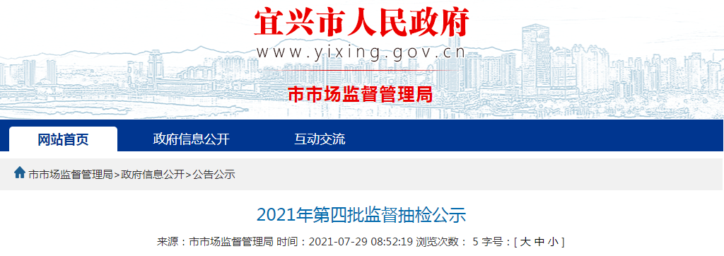 中國(guó)質(zhì)量新聞網(wǎng)訊 2021年7月29日,江蘇省宜興市人民政府網(wǎng)站公示2021年第四批監(jiān)督抽檢。