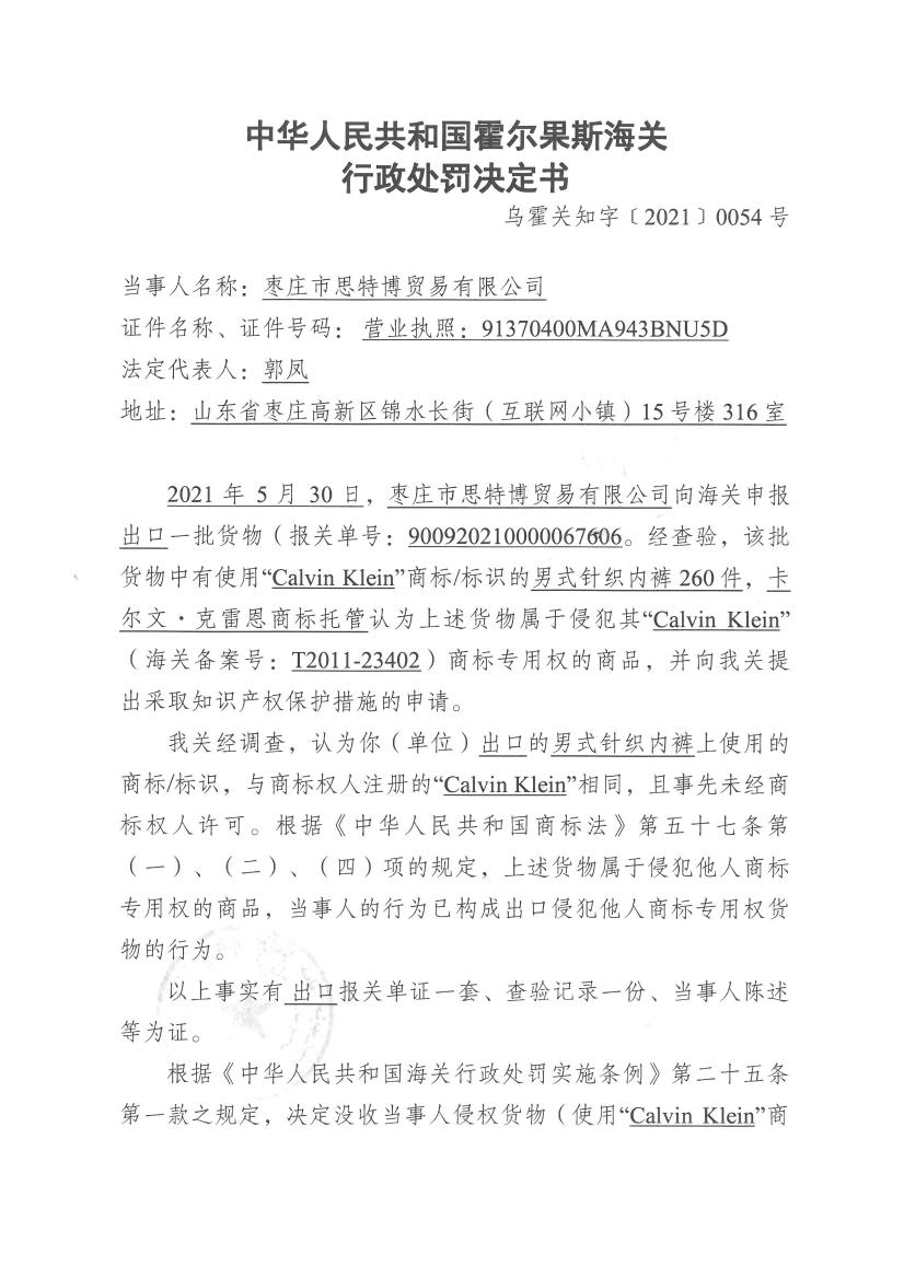 中國質(zhì)量新聞網(wǎng)訊 烏魯木齊海關(guān)網(wǎng)站7月29日發(fā)布霍爾果斯海關(guān)關(guān)于棗莊市思特博貿(mào)易有限公司出口侵犯“Calvin Klein”商標(biāo)專用權(quán)的行政處罰決定書(烏霍關(guān)知字〔2021〕0054號)。詳情見下。