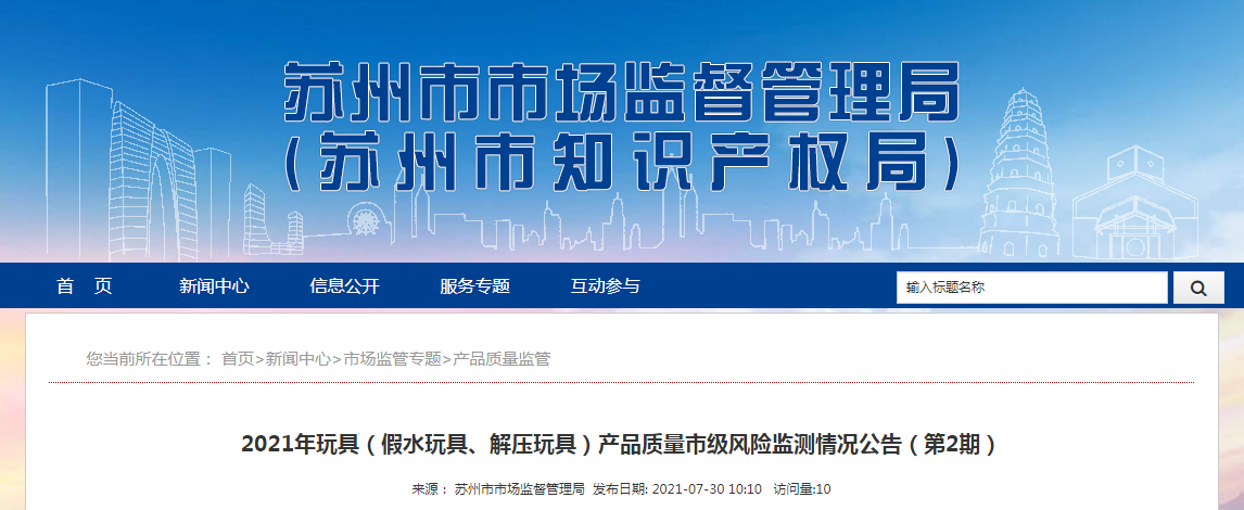中國質(zhì)量新聞網(wǎng)訊 從江蘇省蘇州市市場監(jiān)督管理局網(wǎng)站獲悉,為了評估玩具(假水玩具、解壓玩具)的質(zhì)量安全狀況,2021年二季度,蘇州市市場監(jiān)督管理局委托蘇州市產(chǎn)品質(zhì)量監(jiān)督檢驗(yàn)院對流通領(lǐng)域的玩具(假水玩具、解壓玩具)開展風(fēng)險(xiǎn)監(jiān)測并將有關(guān)情況公告如下: