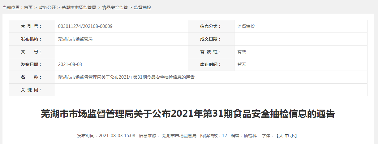 中國質(zhì)量新聞網(wǎng)訊 近日,安徽省蕪湖市市場監(jiān)督管理局公布2021年第31期食品安全抽檢信息。本次共抽檢食用農(nóng)產(chǎn)品51批次,抽檢結(jié)果見下表。
