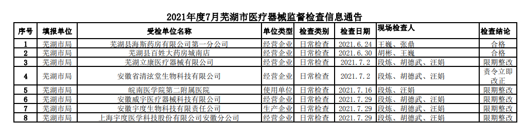 中國(guó)質(zhì)量新聞網(wǎng)訊 近日,安徽省蕪湖市市場(chǎng)監(jiān)督管理局公布2021年度7月蕪湖市醫(yī)療器械監(jiān)督檢查信息。