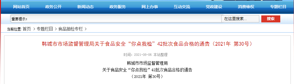 中國質(zhì)量新聞網(wǎng)訊 8月6日,陜西韓城市市場監(jiān)督管理局網(wǎng)站發(fā)布關(guān)于食品安全“你點我檢”42批次食品合格的通告(2021年 第30號)。近期,韓城市市場監(jiān)督管理局按照食品安全“你點我檢”活動安排,組織對糧食加工品、豆制品等2類食品42批次樣品進(jìn)行了食品安全監(jiān)督抽檢,抽樣檢驗項目全部合格。