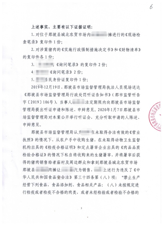 據(jù)了解,2019年10月8日,那坡縣市場監(jiān)管局執(zhí)法人員在該縣城北農(nóng)貿(mào)市場進行日常監(jiān)督檢查時發(fā)現(xiàn),經(jīng)營者吳某某豬肉攤臺面上擺放的16.29公斤豬肉,無動物衛(wèi)生監(jiān)督機構(gòu)出具的檢疫合格訖印章和定點屠宰企業(yè)出具的肉品品質(zhì)檢驗合格訖印章,吳某某亦無法提供上述待銷售豬肉的《動物檢疫合格證明》和《肉品品質(zhì)檢驗合格證》,執(zhí)法人員當場將16.29公斤豬肉進行沒收。