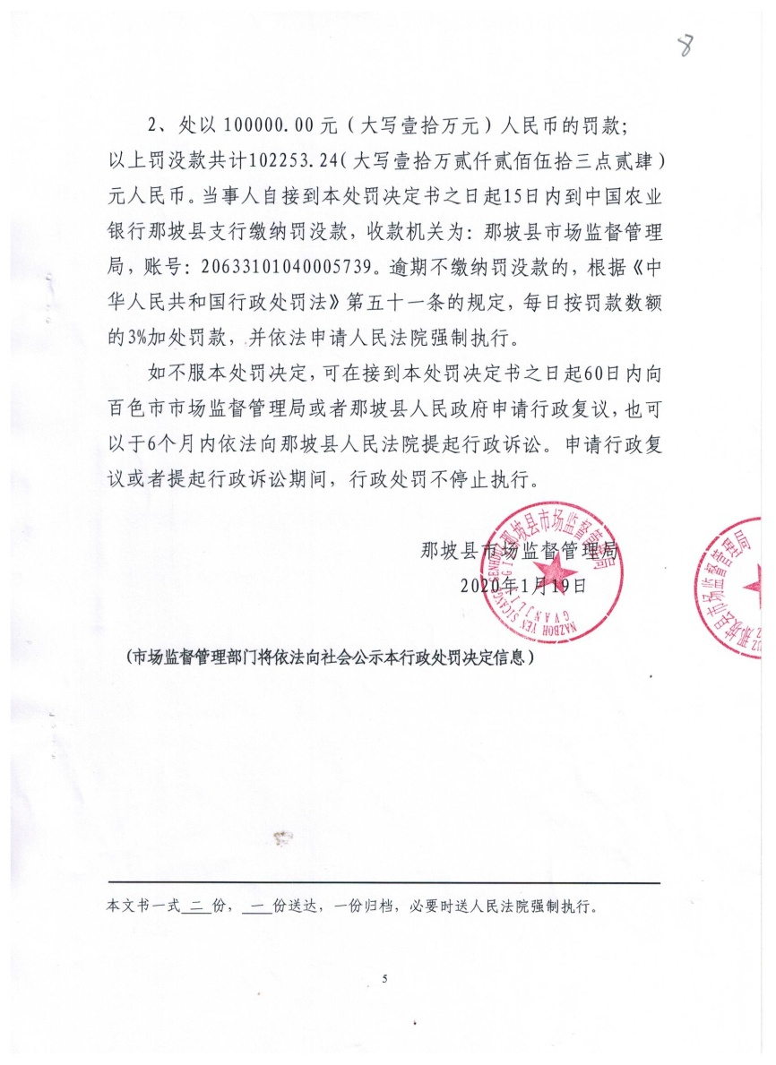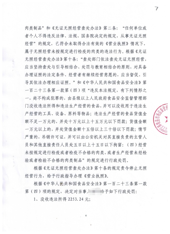 根據(jù)《無證無照經(jīng)營查處辦法》第十條規(guī)定和《食品安全法》第一百二十三條第一款第(四)項規(guī)定,2020年1月19日,那坡縣市場監(jiān)管局作出行政處罰決定,沒收楊某違法所得2253.24元,并處以10萬元的罰款。