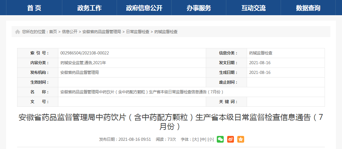中國(guó)質(zhì)量新聞網(wǎng)訊 8月16日,安徽省藥品監(jiān)督管理局網(wǎng)站發(fā)布中藥飲片(含中藥配方顆粒)生產(chǎn)省本級(jí)日常監(jiān)督檢查信息(7月份)。