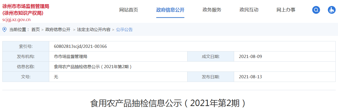 中國質量新聞網訊 近日,江蘇徐州市市場監(jiān)督管理局公示食用農產品抽檢信息(2021年第2期)。2021年5月該局委托徐州市檢驗檢測中心對徐州市各轄區(qū)的農貿市場、超市、大型餐飲經營的食用農產品進行抽檢,本次共抽檢124批次,檢測結果合格118批次,合格率為95.16%。