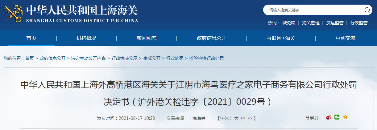 中國質(zhì)量新聞網(wǎng)訊 近日,上海外高橋港區(qū)海關(guān)發(fā)布關(guān)于江陰市海鳥醫(yī)療之家電子商務(wù)有限公司行政處罰決定書(滬外港關(guān)檢違字〔2021〕0029號)。