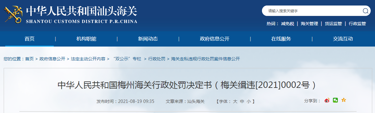 中國質(zhì)量新聞網(wǎng)訊 近日,梅州海關(guān)發(fā)布行政處罰決定書(梅關(guān)緝違[2021]0002號(hào)),涉及梅縣線藝通信元件有限公司。