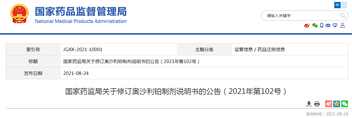國(guó)家藥監(jiān)局關(guān)于修訂奧沙利鉑制劑說明書的公告(2021年第102號(hào))