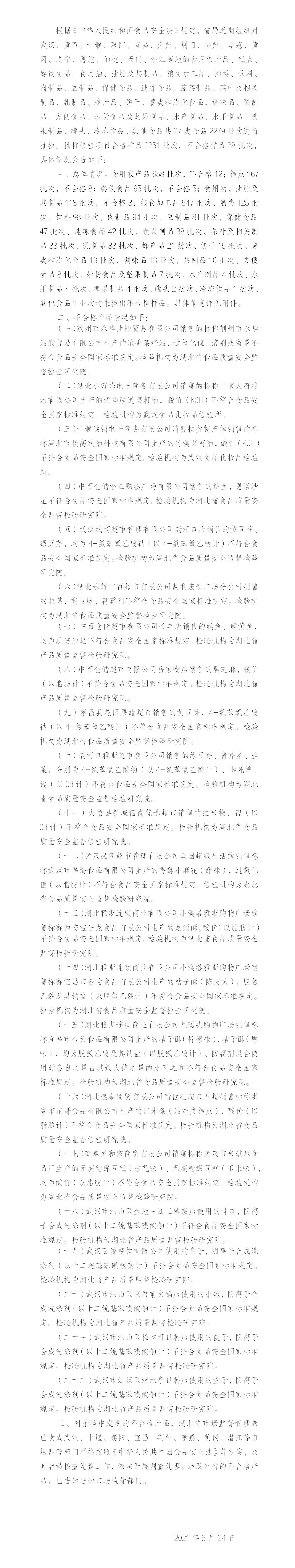 中國質(zhì)量新聞網(wǎng)訊 8月24日,湖北省市場監(jiān)督管理局網(wǎng)站發(fā)布2021年第12期食品安全監(jiān)督抽檢信息。本期檢出28批次食品不合格,涉及食用農(nóng)產(chǎn)品、餐飲食品等。