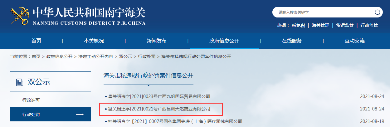 中國(guó)質(zhì)量新聞網(wǎng)訊 8月24日,南寧海關(guān)網(wǎng)站發(fā)布行政處罰案件信息(邕關(guān)緝違字〔2021〕0021號(hào)),涉及廣西昌洲天然藥業(yè)有限公司。