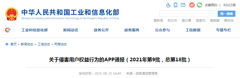 中國質(zhì)量新聞網(wǎng)訊 8月25日,工業(yè)和信息化部信息通信管理局發(fā)布關(guān)于侵害用戶權(quán)益行為的APP通報(2021年第9批,總第18批)。