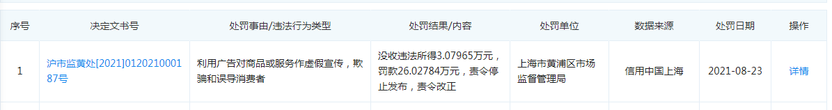 滬市監(jiān)黃處[2021]012021000187號(hào)顯示,該公司處罰事由為“因利用廣告對(duì)商品或服務(wù)作虛假宣傳,欺騙和誤導(dǎo)消費(fèi)者”,上海市黃浦區(qū)市場(chǎng)監(jiān)督管理局對(duì)其沒收違法所得3.07965萬元,罰款26.02784萬元,責(zé)令停止發(fā)布,責(zé)令改正。
