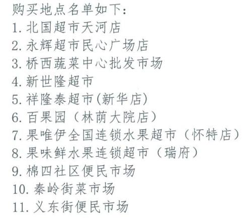 均由工作人員模擬消費者身份,分別在市內(nèi)的北國超市天河店、永輝超市民心廣場店、百果園(林蔭大院店)、果唯伊全國連鎖水果超市(懷特店)、果味鮮水果連鎖超市(瑞府)等11家超市及便民市場內(nèi)購買,購買周期為5天,每天每家蘋果、香蕉各一批次,共選購110批次。