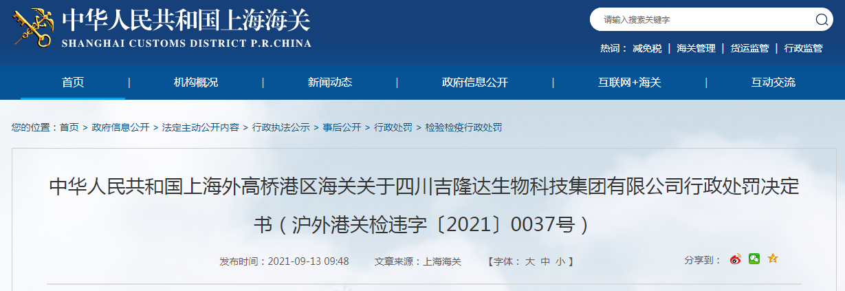 中國質(zhì)量新聞網(wǎng)訊 近日,上海外高橋港區(qū)海關(guān)發(fā)布關(guān)于四川吉隆達(dá)生物科技集團(tuán)有限公司行政處罰決定書(滬外港關(guān)檢違字〔2021〕0037號(hào))。