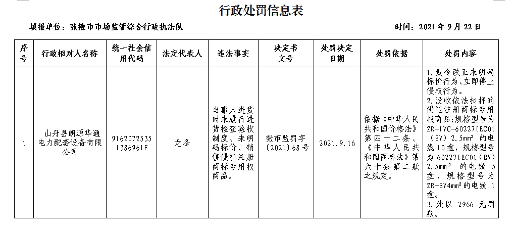 中國(guó)質(zhì)量新聞網(wǎng)訊 近日,甘肅省張掖市市場(chǎng)監(jiān)管局公示行政處罰信息(張市監(jiān)罰字[2021]68號(hào)),涉及山丹縣朗源華通電力配套設(shè)備有限公司。