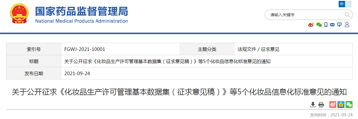 關(guān)于公開征求《化妝品生產(chǎn)許可管理基本數(shù)據(jù)集(征求意見稿)》等5個化妝品信息化標(biāo)準(zhǔn)意見的通知