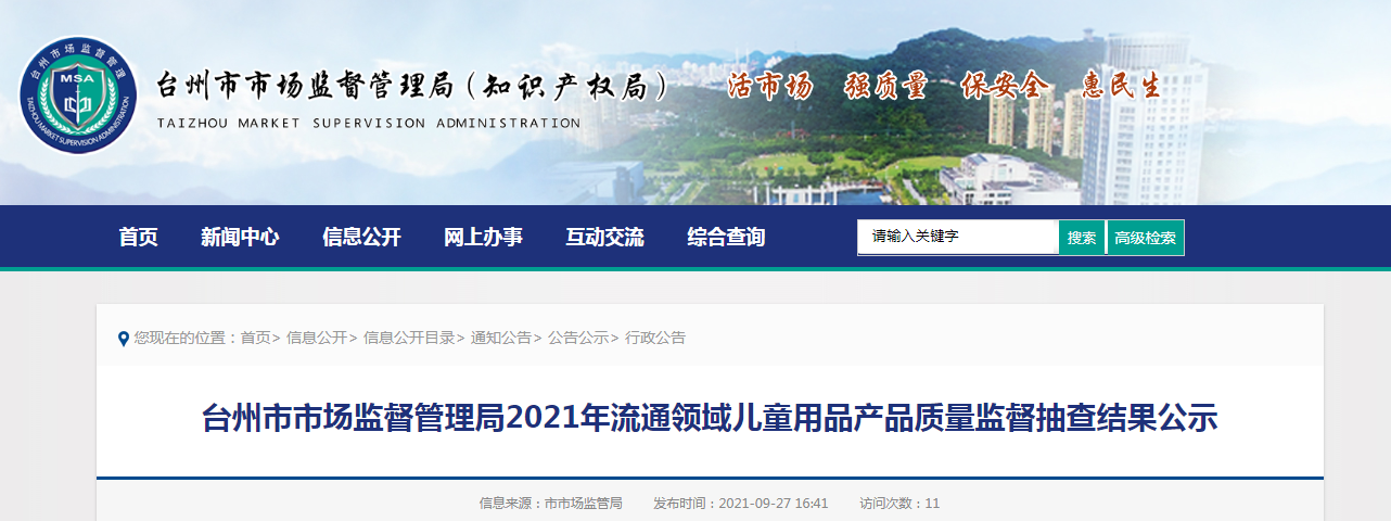 中國(guó)質(zhì)量新聞網(wǎng)訊 9月27日,浙江省臺(tái)州市市場(chǎng)監(jiān)管局網(wǎng)站公示2021年流通領(lǐng)域兒童用品產(chǎn)品質(zhì)量監(jiān)督抽查結(jié)果。
