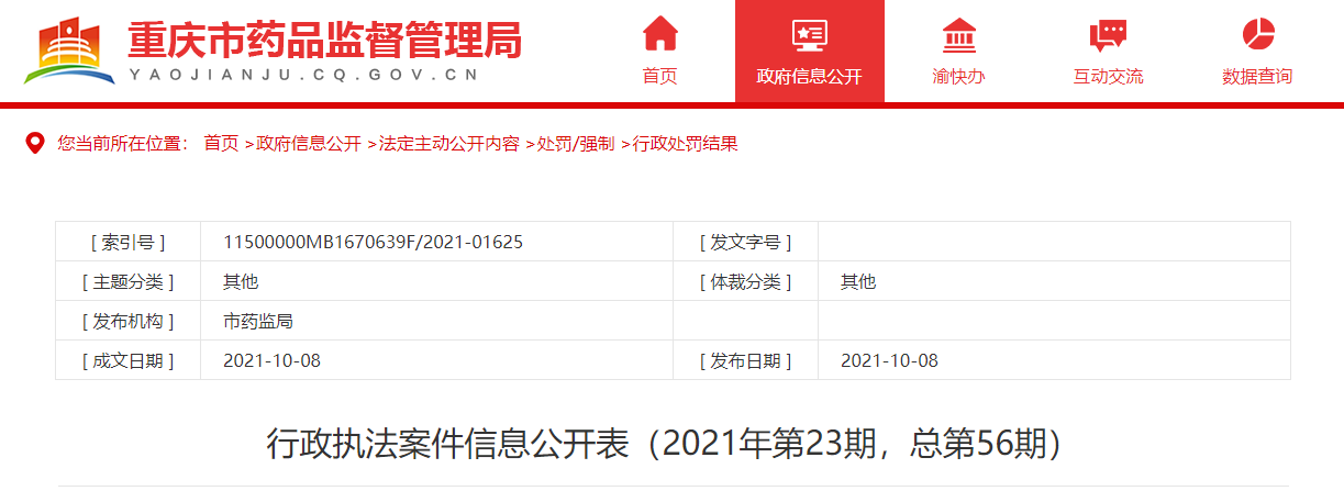 ?1 | 渝藥監(jiān)藥處罰〔2021〕20號 | 重慶三立堂中藥制藥有限公司未遵守《藥品生產(chǎn)質(zhì)量管理規(guī)范》生產(chǎn)中藥飲片案 | 重慶三立堂中藥制藥有限公司 | 91500222MA5U3EYM4U | 姚代泉 | 重慶三立堂中藥制藥有限公司在生產(chǎn)中藥飲片過程中,存在以工藝回顧性驗證代替產(chǎn)品工藝驗證、未經(jīng)過評估直接引用原藥材含量測定數(shù)據(jù)等未遵守《藥品生產(chǎn)質(zhì)量管理規(guī)范》的行為,違反了《中華人民共和國藥品管理法》(2019年修訂版)第四十三條第一款的規(guī)定。 | ? 處罰的種類:警告。 處罰的依據(jù):《中華人民共和國藥品管理法》(2019年修訂版)第一百二十六條。 ? ? | 重慶市藥品監(jiān)督管理局 | |||