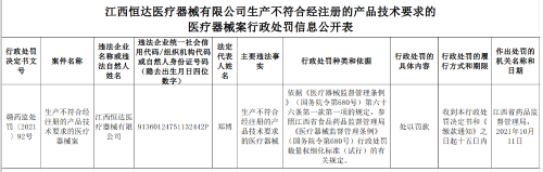 中國(guó)質(zhì)量新聞網(wǎng)訊 10月18日,江西省藥監(jiān)局網(wǎng)站公開(kāi)醫(yī)療器械行政處罰信息,涉及江西恒達(dá)醫(yī)療器械有限公司。