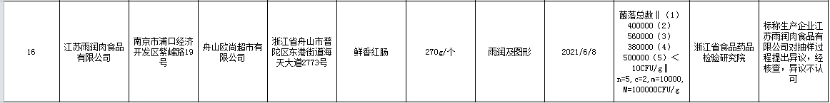 通告顯示,舟山歐尚超市有限公司銷售的標稱江蘇雨潤肉食品有限公司生產的鮮香紅腸(規(guī)格型號:270g/個,生產日期/批號:2021/6/8),菌落總數不符合食品安全國家標準規(guī)定。檢驗機構為浙江省食品藥品檢驗研究院。江蘇雨潤肉食品有限公司對抽樣過程提出異議,經核查對該異議不予認可。