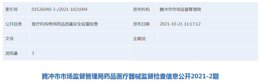 中國質(zhì)量新聞網(wǎng)訊 10月21日,云南省騰沖市市場監(jiān)督管理局公開藥品醫(yī)療器械監(jiān)督檢查信息(2021-2期)。