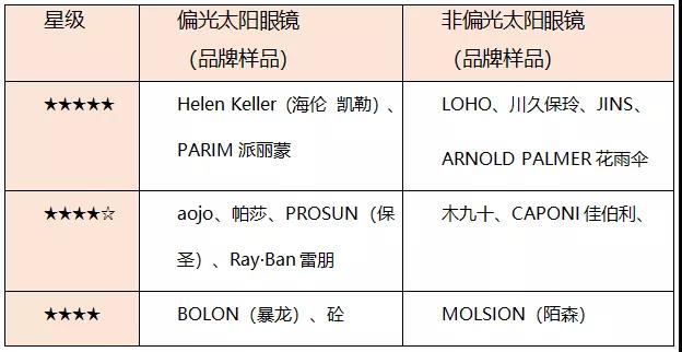 太陽眼鏡比較試驗(yàn)總評(píng)表