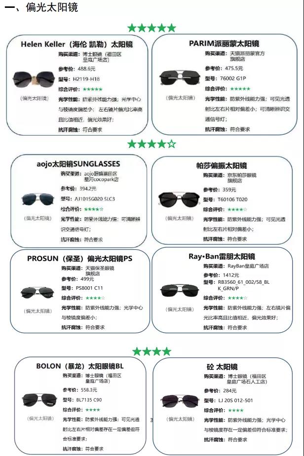 本次太陽眼鏡比較試驗(yàn)總評(píng)結(jié)果如下(評(píng)價(jià)結(jié)果用“★”表示,“☆”表示半星,“★”越多表示結(jié)果越好,同星級(jí)樣品排名不分先后):