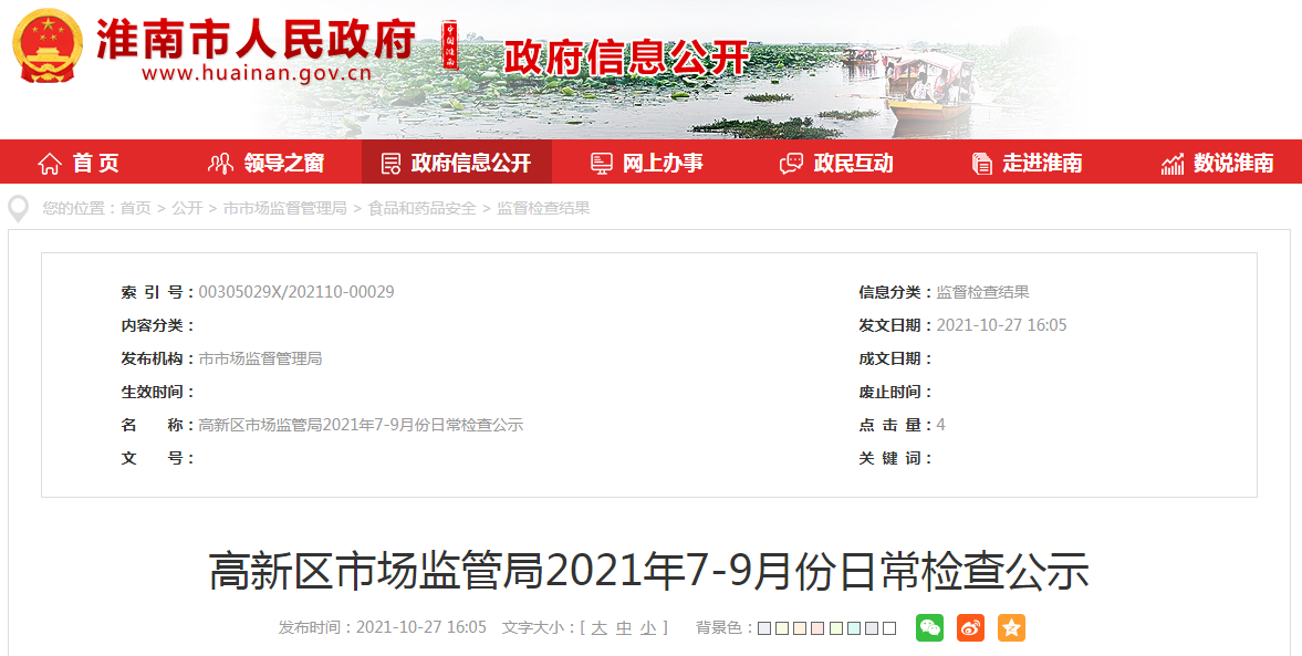 中國質(zhì)量新聞網(wǎng)訊 近日,安徽省淮南市高新區(qū)市場監(jiān)管局公示2021年7-9月份日常檢查情況。
