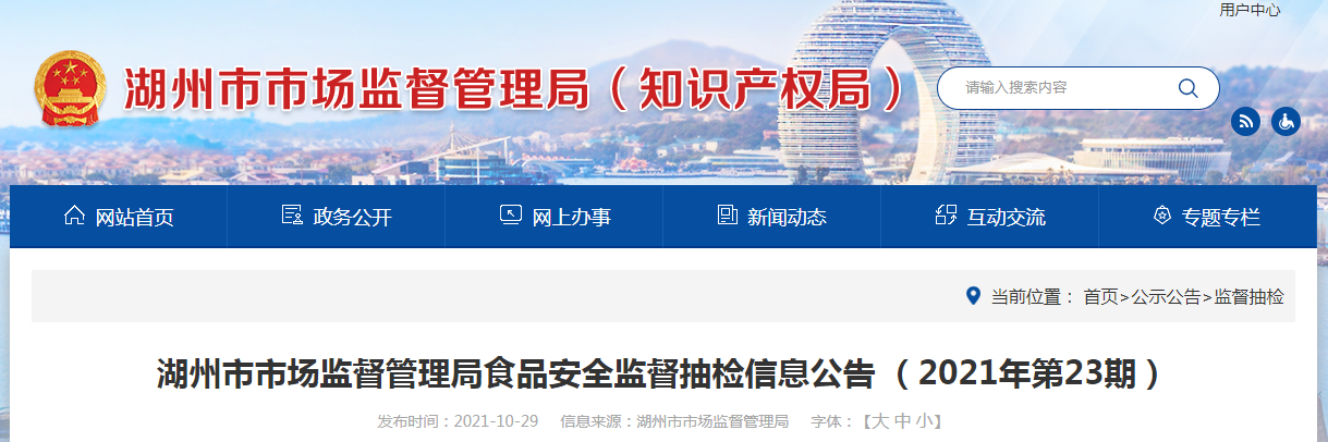 中國質(zhì)量新聞網(wǎng)訊 10月29日,浙江湖州市市場監(jiān)督管理局網(wǎng)站發(fā)布食品安全監(jiān)督抽檢信息公告(2021年第23期)。公告稱,近期,該局組織抽檢糧食加工品、炒貨食品及堅(jiān)果制品、蛋制品、食糖、水產(chǎn)制品、淀粉及淀粉制品、糕點(diǎn)、豆制品、蜂產(chǎn)品、餐飲食品、食用農(nóng)產(chǎn)品等22類食品370批次樣品。根據(jù)食品安全國家標(biāo)準(zhǔn)檢驗(yàn)和判定:抽樣檢驗(yàn)合格364批次、不合格6批次,不合格項(xiàng)目涉及質(zhì)量指標(biāo)不達(dá)標(biāo)、超范圍使用食品添加劑、農(nóng)獸藥殘留超標(biāo)、重金屬污染等問題。具體情況如下:
