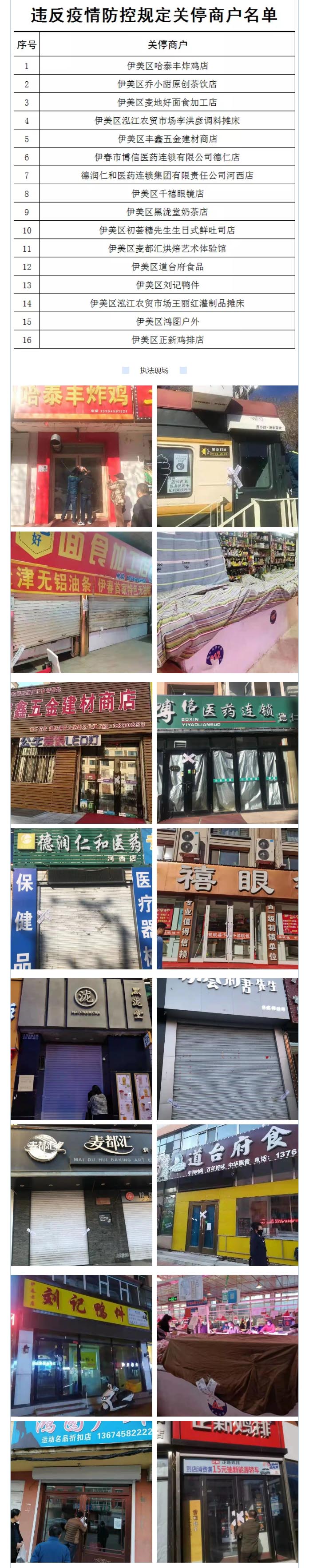 10月31日至11月2日,執(zhí)法人員對(duì)轄區(qū)內(nèi)農(nóng)貿(mào)市場、藥店、熟食店、蛋糕店等重點(diǎn)經(jīng)營場所執(zhí)行體溫檢測(cè)、掃碼查驗(yàn)、消殺晨檢、人員健康管理等疫情防控措施情況進(jìn)行全面檢查,對(duì)未嚴(yán)格執(zhí)行防控措施、落實(shí)防控主體責(zé)任不到位的16家商戶責(zé)令停業(yè)整頓。