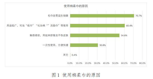 本次消費問卷調(diào)查共收回273份有效問卷。調(diào)查結(jié)果顯示,關(guān)于消費者選用棉柔巾的原因,70.7%的消費者認(rèn)為毛巾容易滋生細(xì)菌,60.4%的消費者認(rèn)為其用途較廣,可當(dāng)“紙巾”“化妝棉”“洗臉巾”等使用,而54.6%的消費者認(rèn)為觸感柔軟,用起來舒服且不傷皮膚。