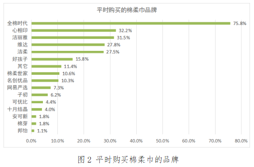 平時較多消費者選購的棉柔巾品牌是全棉時代、心相印和潔麗雅,占比分別為75.8%,32.2%和31.5%。
