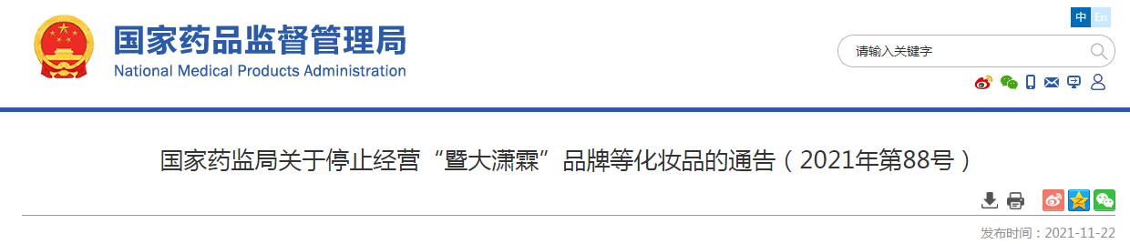 國家藥監(jiān)局關于停止經營“暨大瀟霖”品牌等化妝品的通告(2021年第88號)