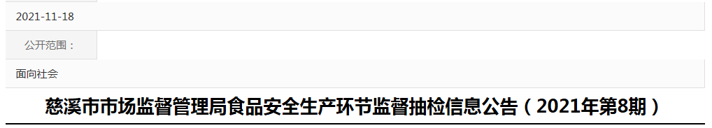 中國質(zhì)量新聞網(wǎng)訊 近日,浙江省慈溪市市場監(jiān)督管理局發(fā)布食品安全生產(chǎn)環(huán)節(jié)監(jiān)督抽檢信息(2021年第8期)。2021年11月份,該局食品生產(chǎn)加工環(huán)節(jié)組織監(jiān)督抽檢125批,分別為餅干2批次,炒貨食品及堅果制品5批次,蛋制品2批次,淀粉及淀粉制品7批次,豆制品5批次,糕點5批次,酒類2批次,可可及焙烤咖啡產(chǎn)品1批次,糧食加工品46批次,食糖3批次,蔬菜制品19批次,薯類和膨化食品2批次,速凍食品3批次,調(diào)味品14批次,飲料9批次。