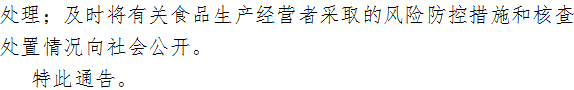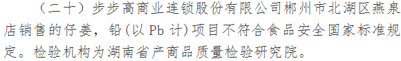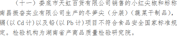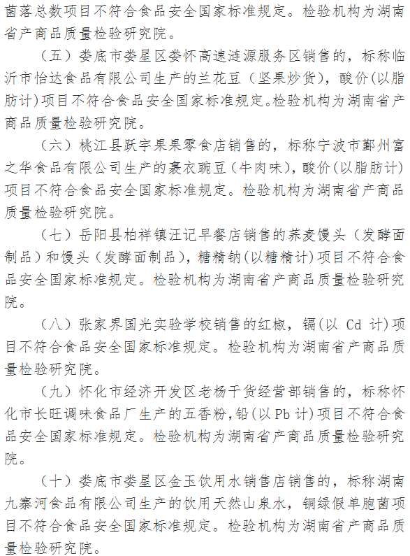 本期檢出31批次食品不合格,涉及標(biāo)稱生產(chǎn)企業(yè)湘潭市雨湖區(qū)鈺龍食品廠、平江縣田良君食品有限公司、臨沂市怡達(dá)食品有限公司、寧波市鄞州富之華食品有限公司、湖南省懷化市長(zhǎng)旺調(diào)味食品廠、湖南九寨河食品有限公司、南昌振奮實(shí)業(yè)有限公司、長(zhǎng)沙市緣之翼食品有限公司、湖南卡麥?zhǔn)称酚邢薰?、成都人民營(yíng)養(yǎng)食品廠、張家界眾旺農(nóng)產(chǎn)品開(kāi)發(fā)有限公司等。