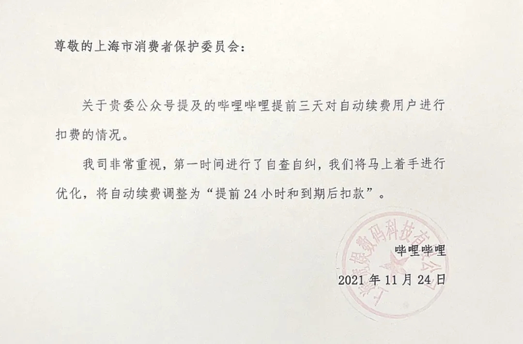 今天,上海市消保委就收到了嗶哩嗶哩就“自動續(xù)費提前3天扣款”的回應,公司表示非常重視,第一時間進行自查自糾,并將馬上著手進行優(yōu)化,將自動續(xù)費期限調整為“提前24小時和到期后扣款”。