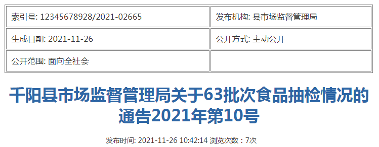 中國質(zhì)量新聞網(wǎng)訊 11月26日,陜西千陽縣市場監(jiān)督管理局發(fā)布關(guān)于63批次食品抽檢情況的通告(2021年第10號(hào))。通告稱,近期,該局組織共抽檢63批次,其中餐飲食品62批次,小作坊食品1批次。本次抽樣檢驗(yàn)項(xiàng)目樣品63批次均合格。