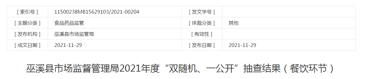 中國質(zhì)量新聞網(wǎng)訊 近日,重慶市巫溪縣市場監(jiān)督管理局公布2021年度“雙隨機(jī)、一公開”抽查結(jié)果(餐飲環(huán)節(jié))。