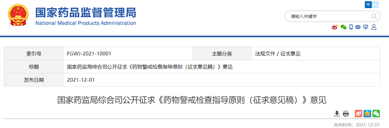 為貫徹落實《中華人民共和國藥品管理法》《中華人民共和國疫苗管理法》,指導(dǎo)藥品監(jiān)督管理部門規(guī)范開展藥物警戒檢查工作,國家藥監(jiān)局組織起草了《藥物警戒檢查指導(dǎo)原則(征求意見稿)》(見附件1),現(xiàn)向社會公開征求意見。