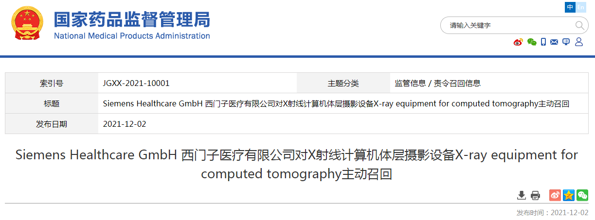 西門子醫(yī)療系統(tǒng)有限公司報(bào)告,由于涉及特定型號(hào)、特定批次產(chǎn)品,存在使用特定版本進(jìn)行頭部掃描時(shí),圖像質(zhì)量有降低的潛在風(fēng)險(xiǎn)的問題,生產(chǎn)商Siemens Healthcare GmbH 西門子醫(yī)療有限公司對(duì)X射線計(jì)算機(jī)體層攝影設(shè)備X-ray equipment for computed tomography(注冊(cè)證號(hào):國(guó)械注進(jìn)20183060438、20173301120、20173061125、20173301122、20173301126、20173301123)主動(dòng)召回。召回級(jí)別為二級(jí)。涉及產(chǎn)品的型號(hào)、規(guī)格及批次等詳細(xì)信息見《醫(yī)療器械召回事件報(bào)告表》。