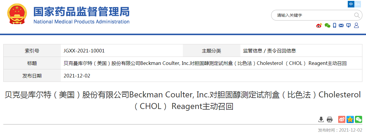 貝克曼庫爾特(中國)股份有限公司報告,由于涉及特定型號、特定批次產品,存在超出低水平校準范圍(OCR低水平)和/或Back to Back(B/B)等錯誤,使得膽固醇測定試劑盒(比色法)試劑檢測失敗的問題,生產商貝克曼庫爾特(美國)股份有限公司Beckman Coulter,Inc對膽固醇測定試劑盒(比色法)Cholesterol (CHOL) Reagent(注冊證號:國械注進20182402320)主動召回。召回級別為三級。涉及產品的型號、規(guī)格及批次等詳細信息見《醫(yī)療器械召回事件報告表》。