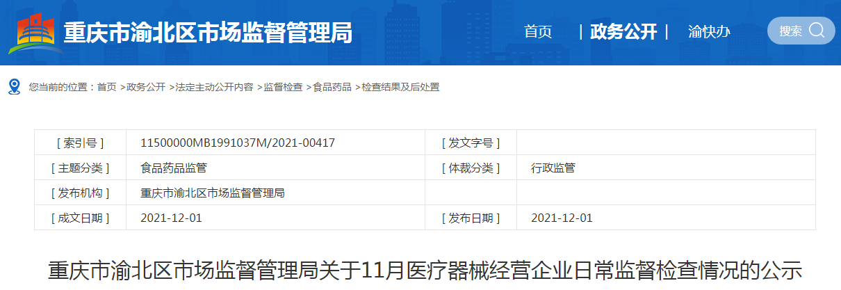 中國質(zhì)量新聞網(wǎng)訊 12月1日,重慶市渝北區(qū)市場監(jiān)管局網(wǎng)站公示11月醫(yī)療器械經(jīng)營企業(yè)日常監(jiān)督檢查情況。