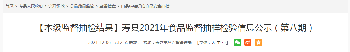 中國質量新聞網(wǎng)訊 近日,安徽省壽縣市場監(jiān)督管理局公示2021年第八期食品監(jiān)督抽樣檢驗信息。