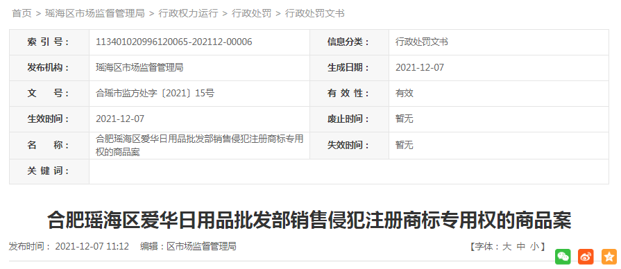 行政處罰決定書(shū)文號(hào):合瑤市監(jiān)方處字〔2021〕15號(hào)