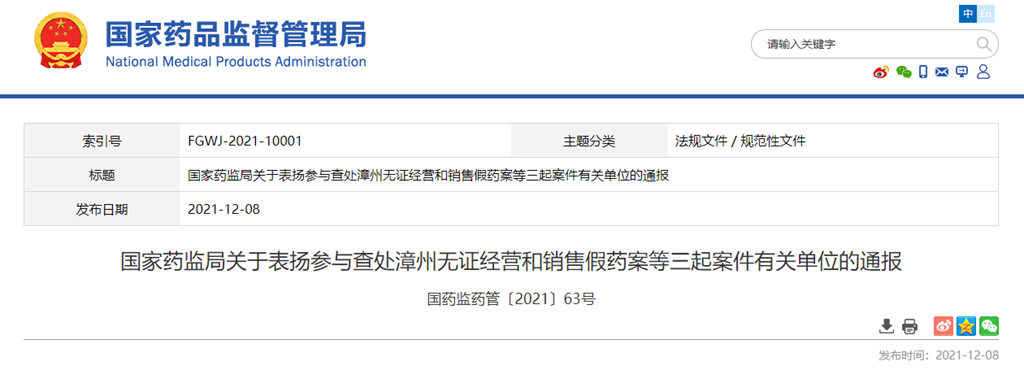 國(guó)家藥監(jiān)局關(guān)于表揚(yáng)參與查處漳州無證經(jīng)營(yíng)和銷售假藥案等三起案件有關(guān)單位的通報(bào)